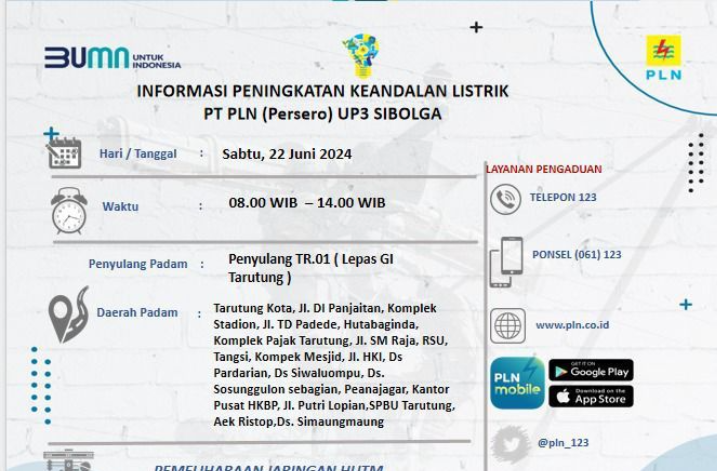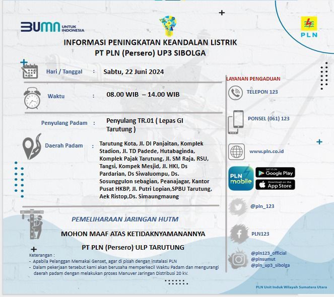 Sehubung adanya peningkatan keandalan listrik di daerah Tapanuli Utara, akan ada pemadaman listrik di lokasi tertentu pada hari sabtu, 22 Juni 2024. Pukul 08 - 14.00 Wib.